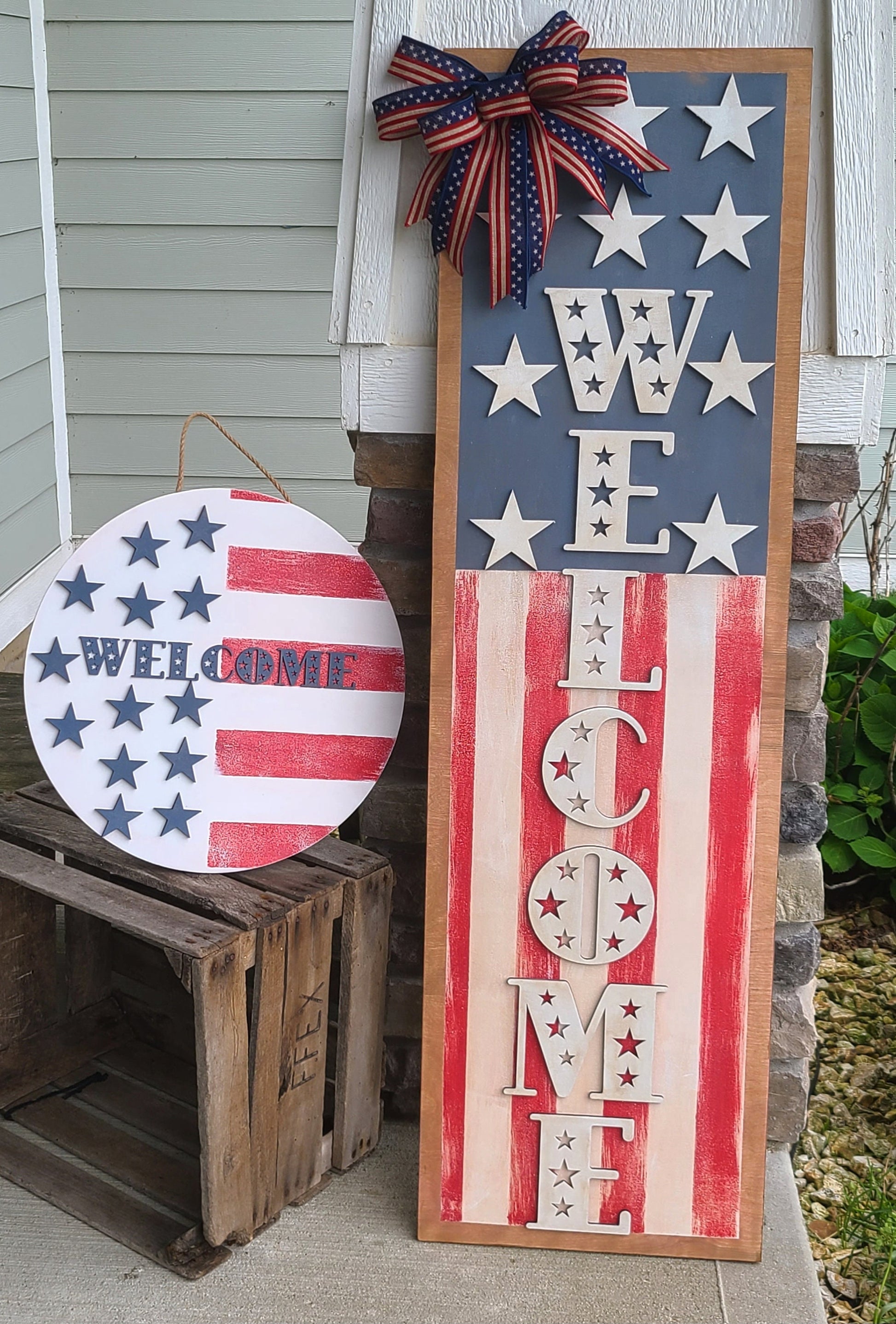 Patriotic Welcome Door Leaner, Rustic Farmhouse Front Porch Decor, Stars and Stripes Welcome Sign, Housewarming Gift, Porch Decor, Wooden