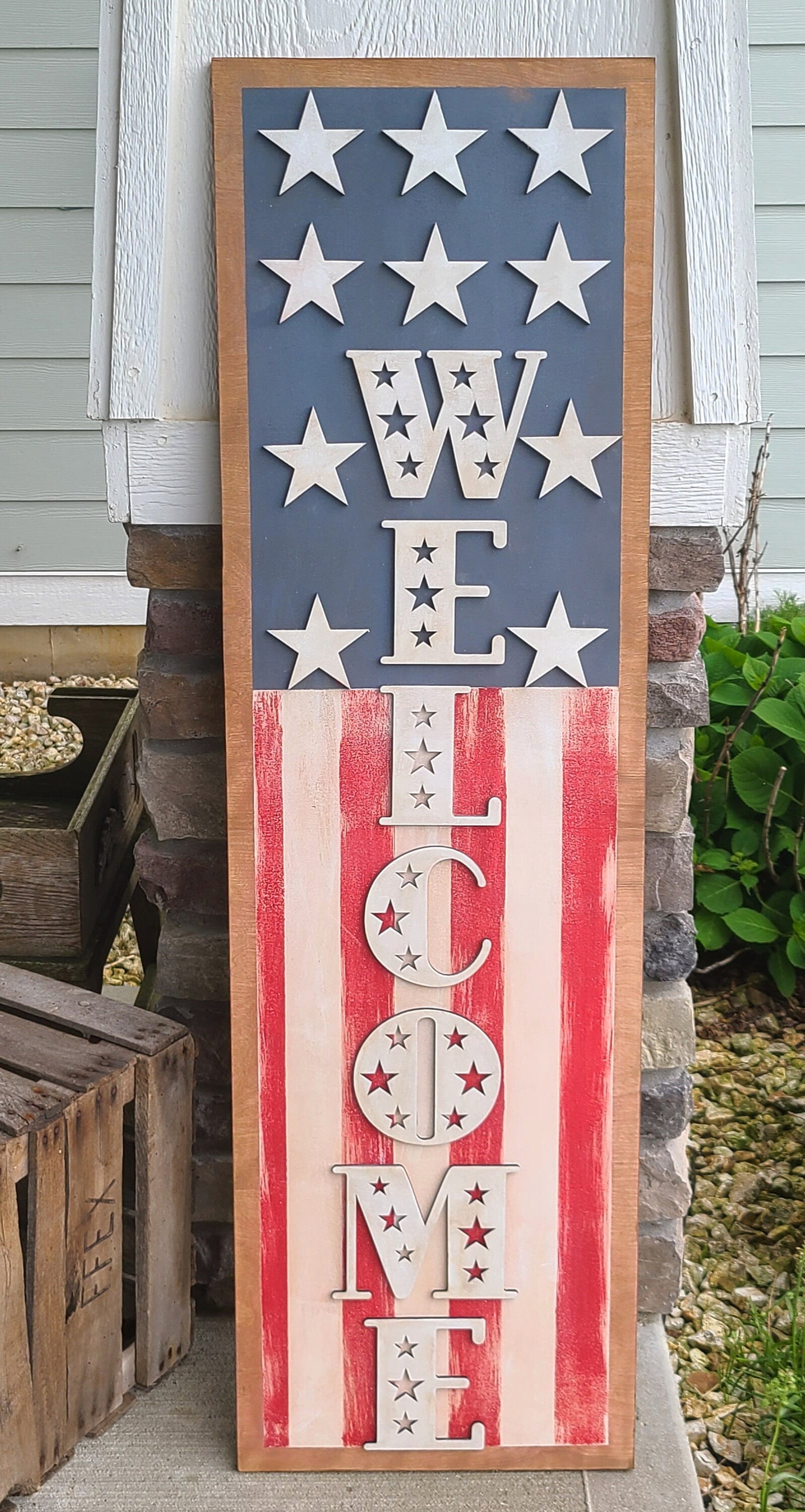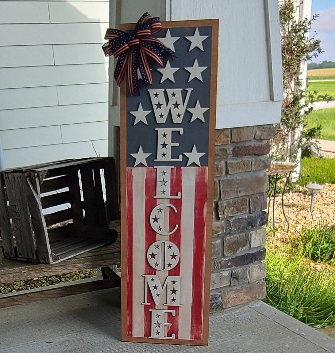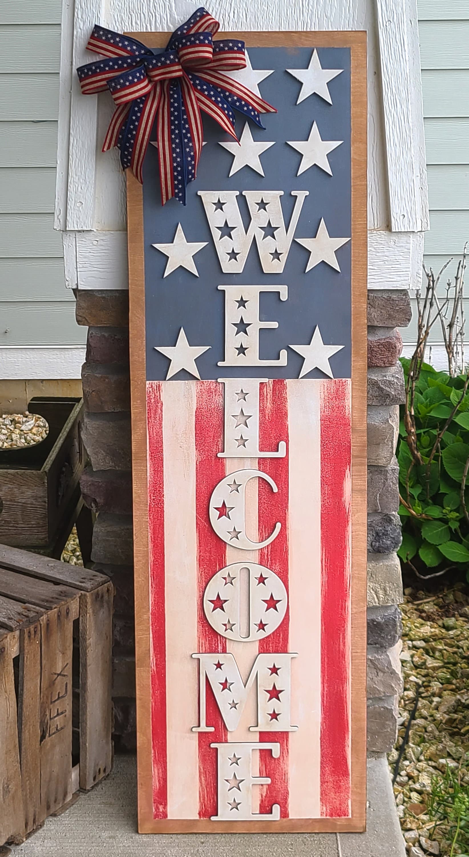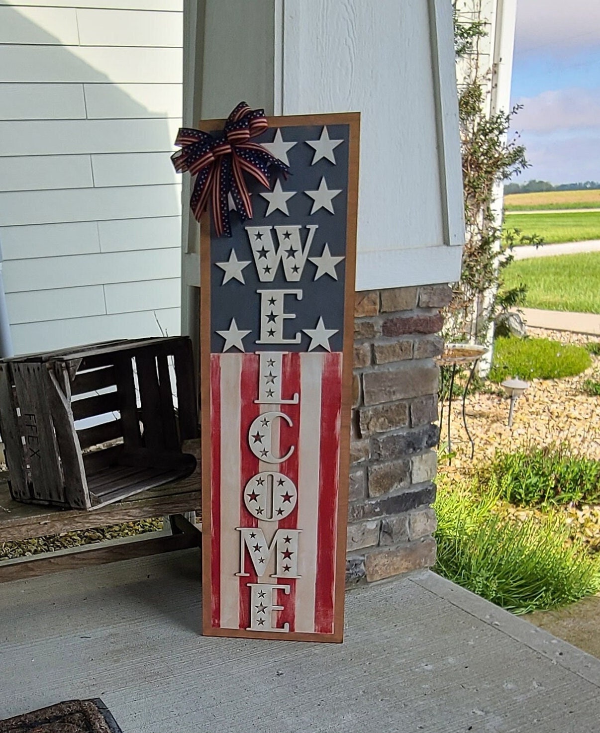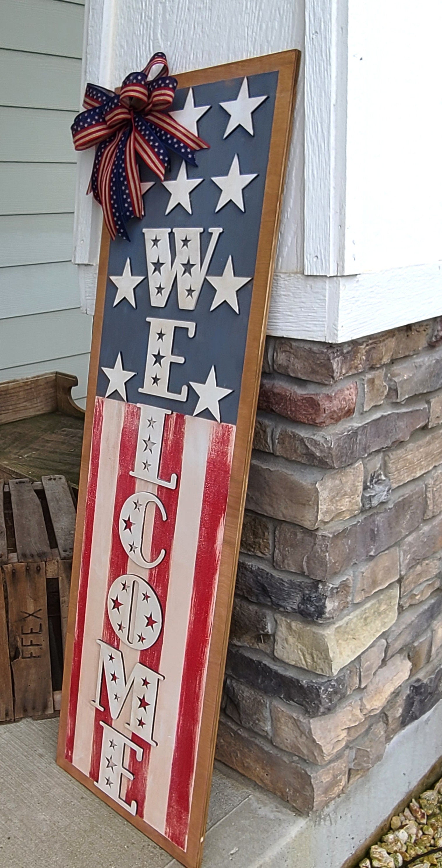 Handmade, Rustic, Distressed, Faux Aged 3D Patriotic Wooden Welcome Front Porch Door Leaner. Great Front Porch Decor from Memorial Day Thru the 4th of July. All Signs Are Hand Cut, Hand Painted, and Stained. Letters and Stars are Laser Cut and hand painted.