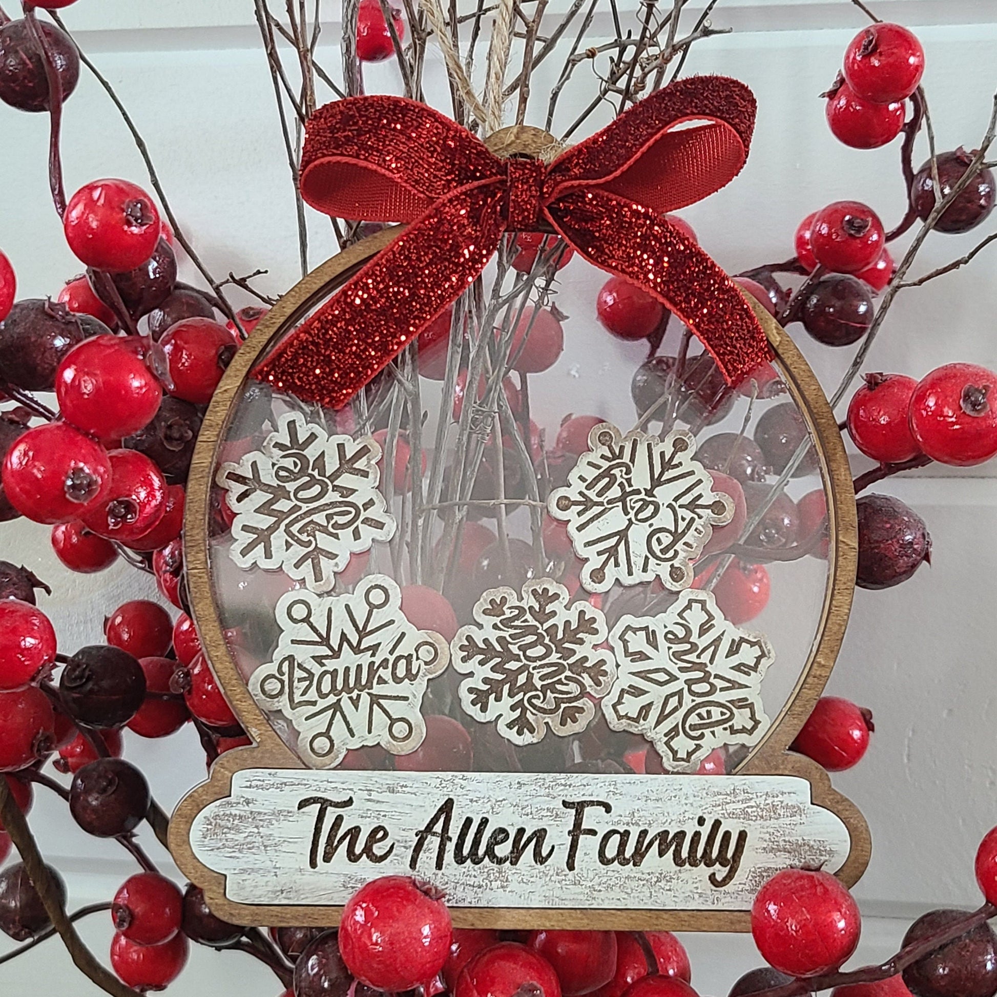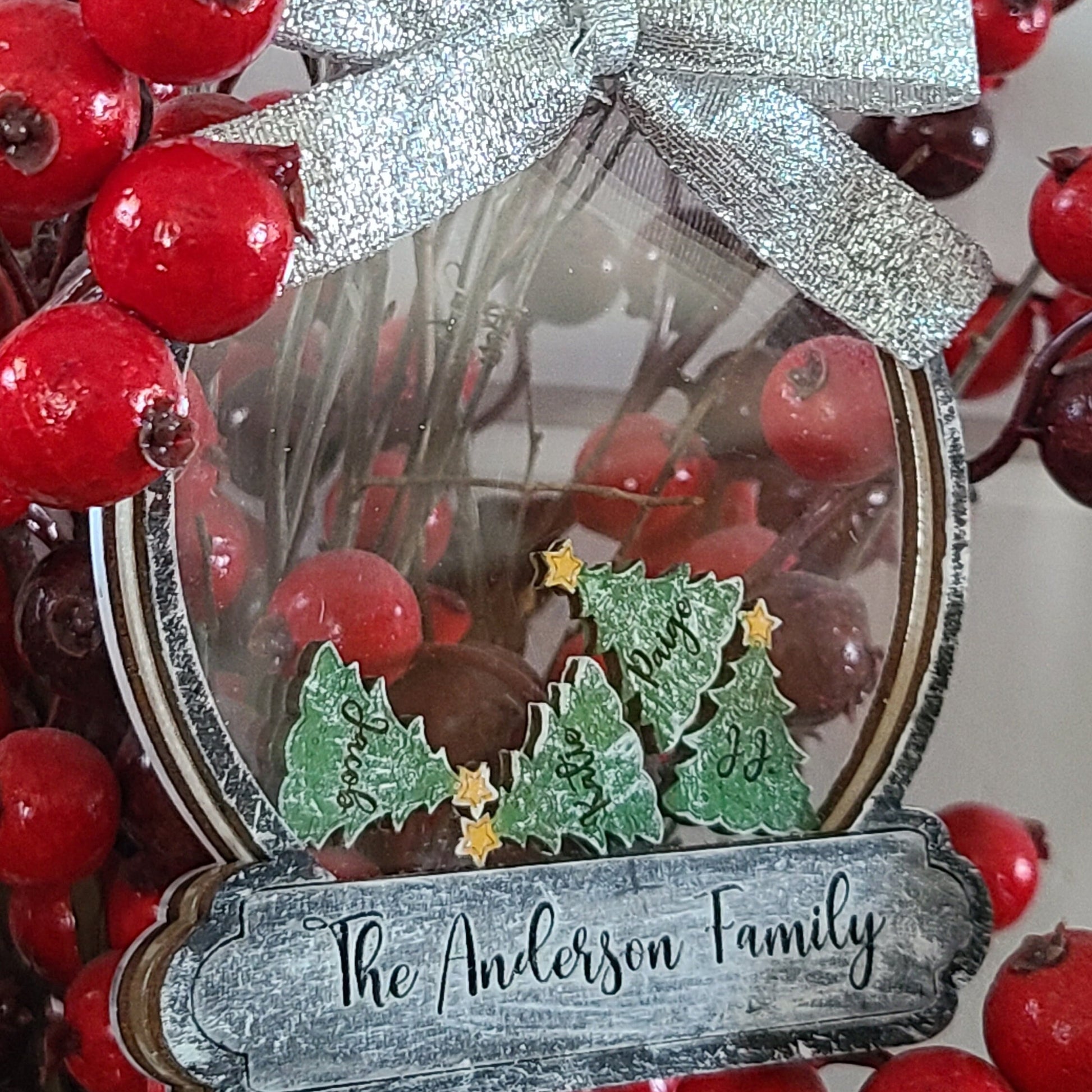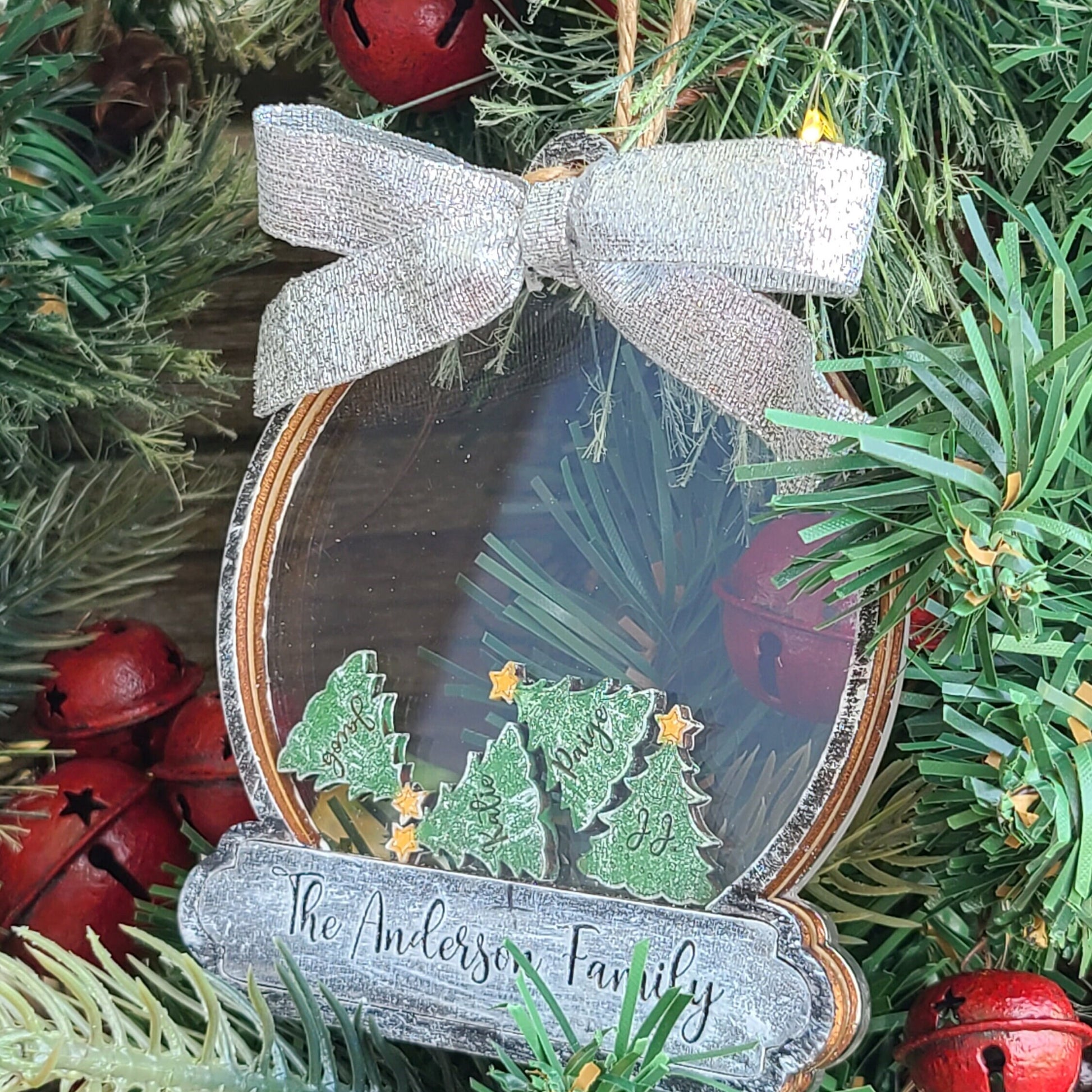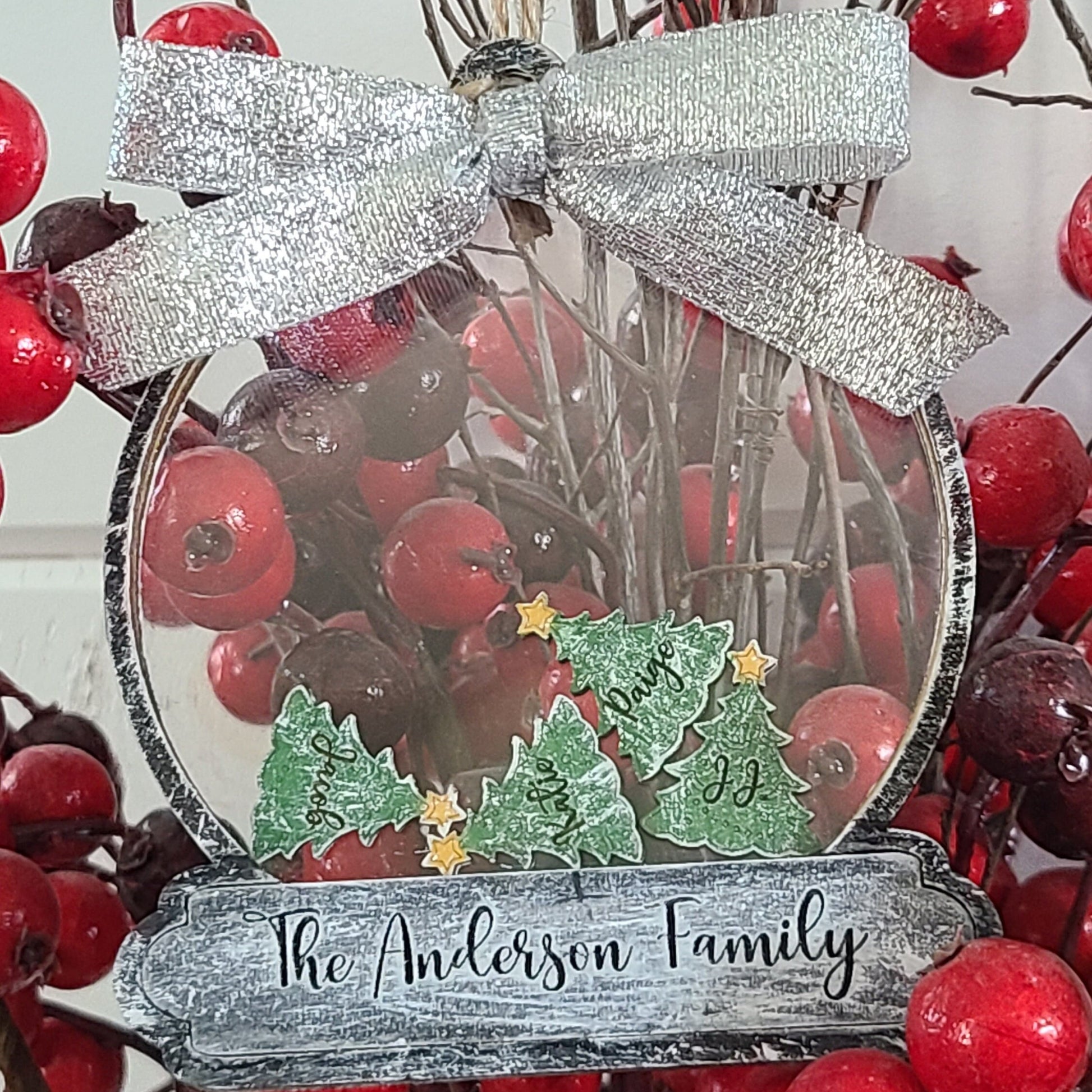 Custom Options: 1. Choose Ornament Size and Color 2. Choose Between Snowflakes or Trees (size of charms will very due to # of charms and size of ornament chosen.) 3. Choose Font Style: Allen Font or Anderson Font 4. Family Last Name and Family Members Names (please ensure spelling is correct) 5. Choose Bow Color: Red Glitter, Silver Glitter or Gold Glitter