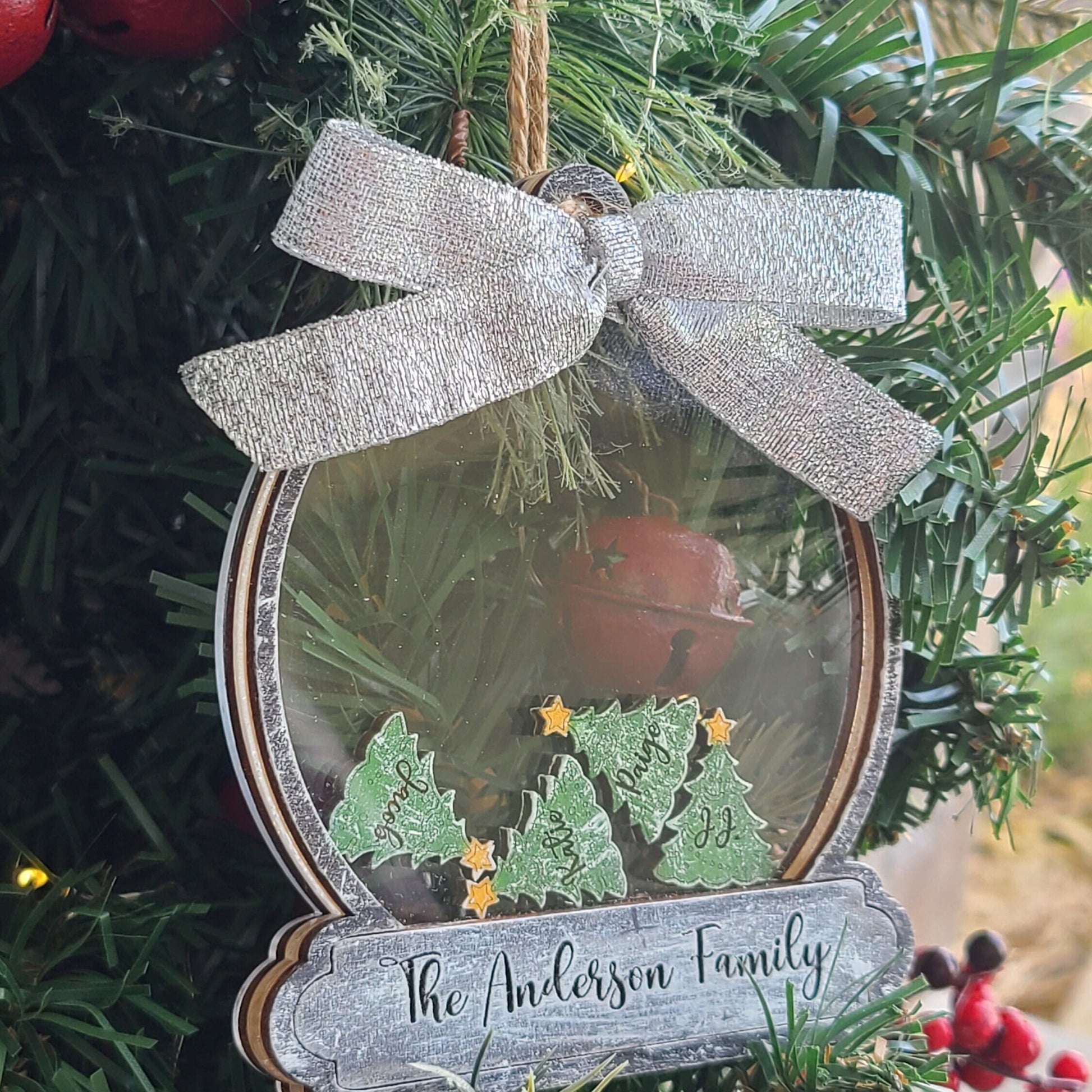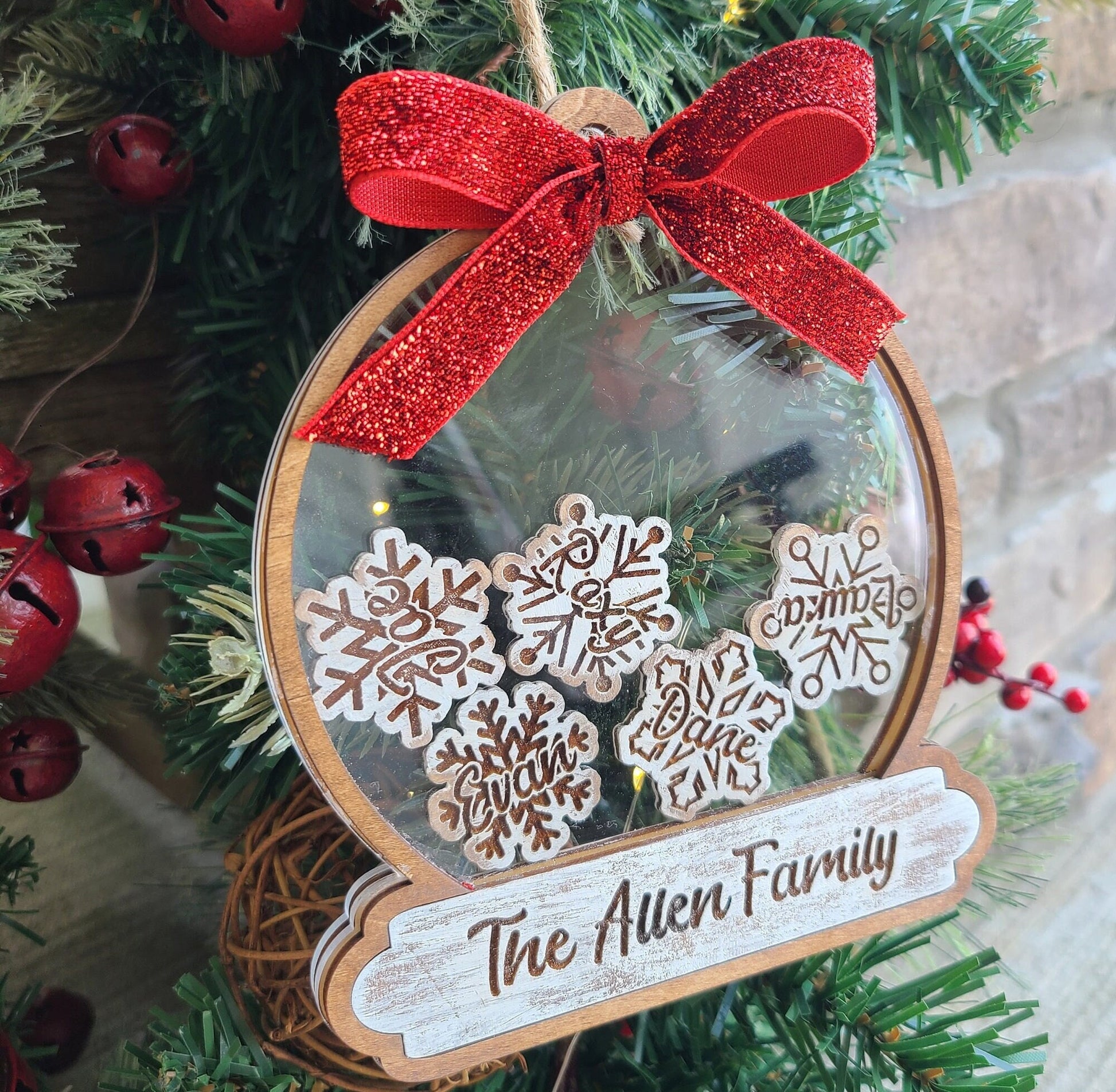 Everyone Loves A Personalized Christmas Gift. Make This Holiday Extra Special With Our Customizable Shaker Snow Globe Family Ornament. We Offer 2 sizes: 6" x 5" (Shown in Allen) or 4.5" x 3.75" (Shown in Anderson). Ornaments are made from Basswood and Clear Acrylic. Family Last Name And Charm Names Are Engraved Into The Wood. Twine Hanger and Choice of Glitter Bow Included.