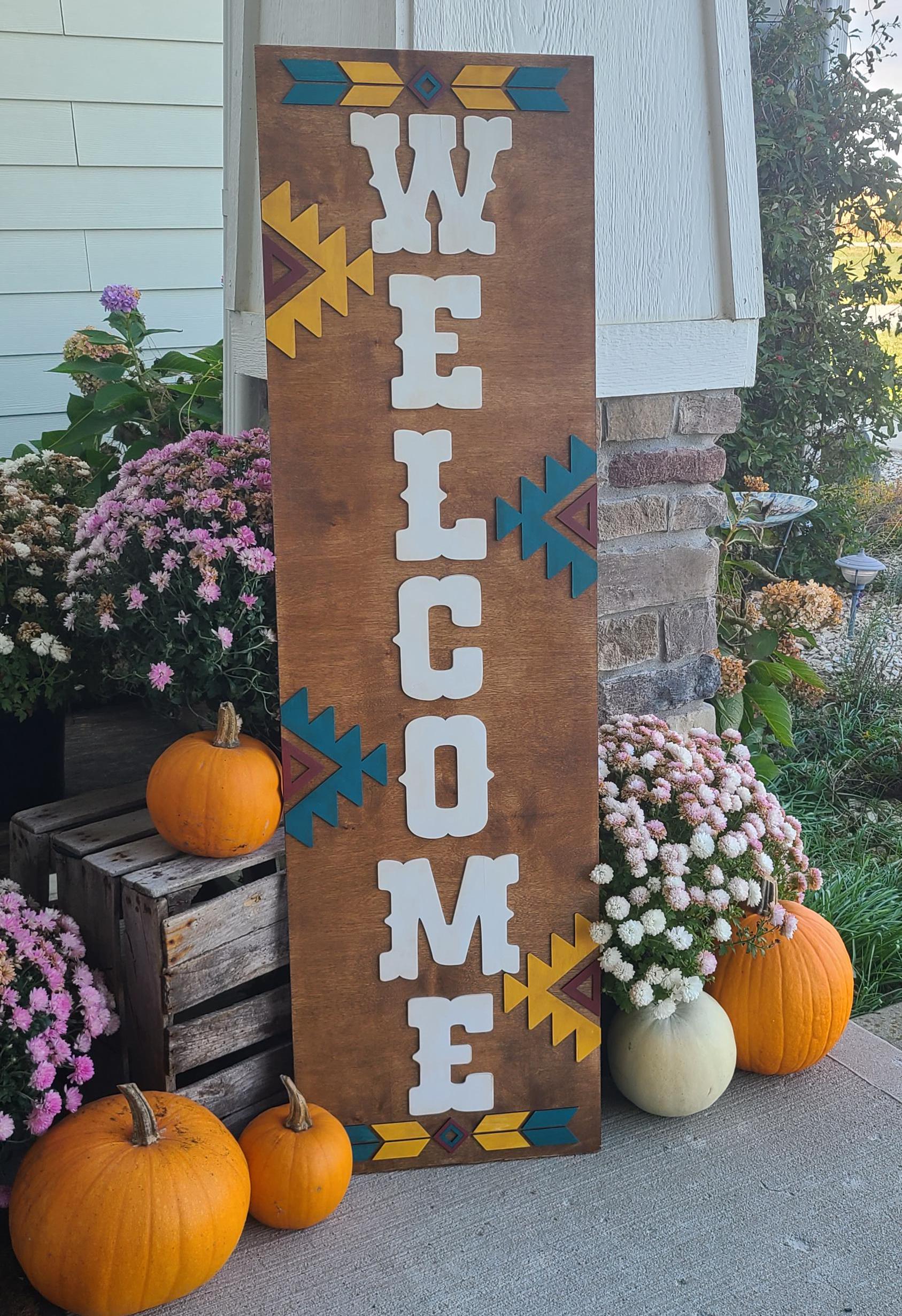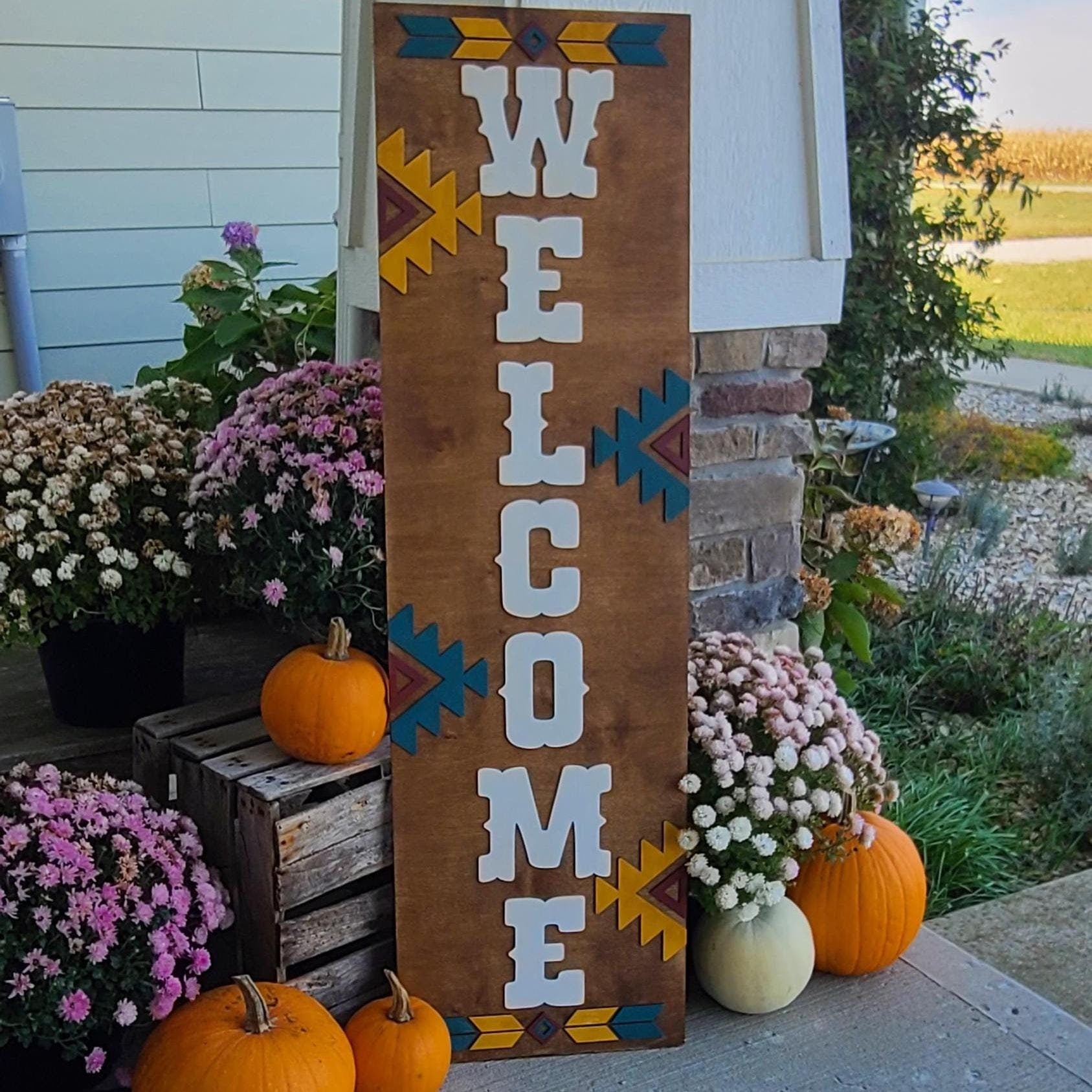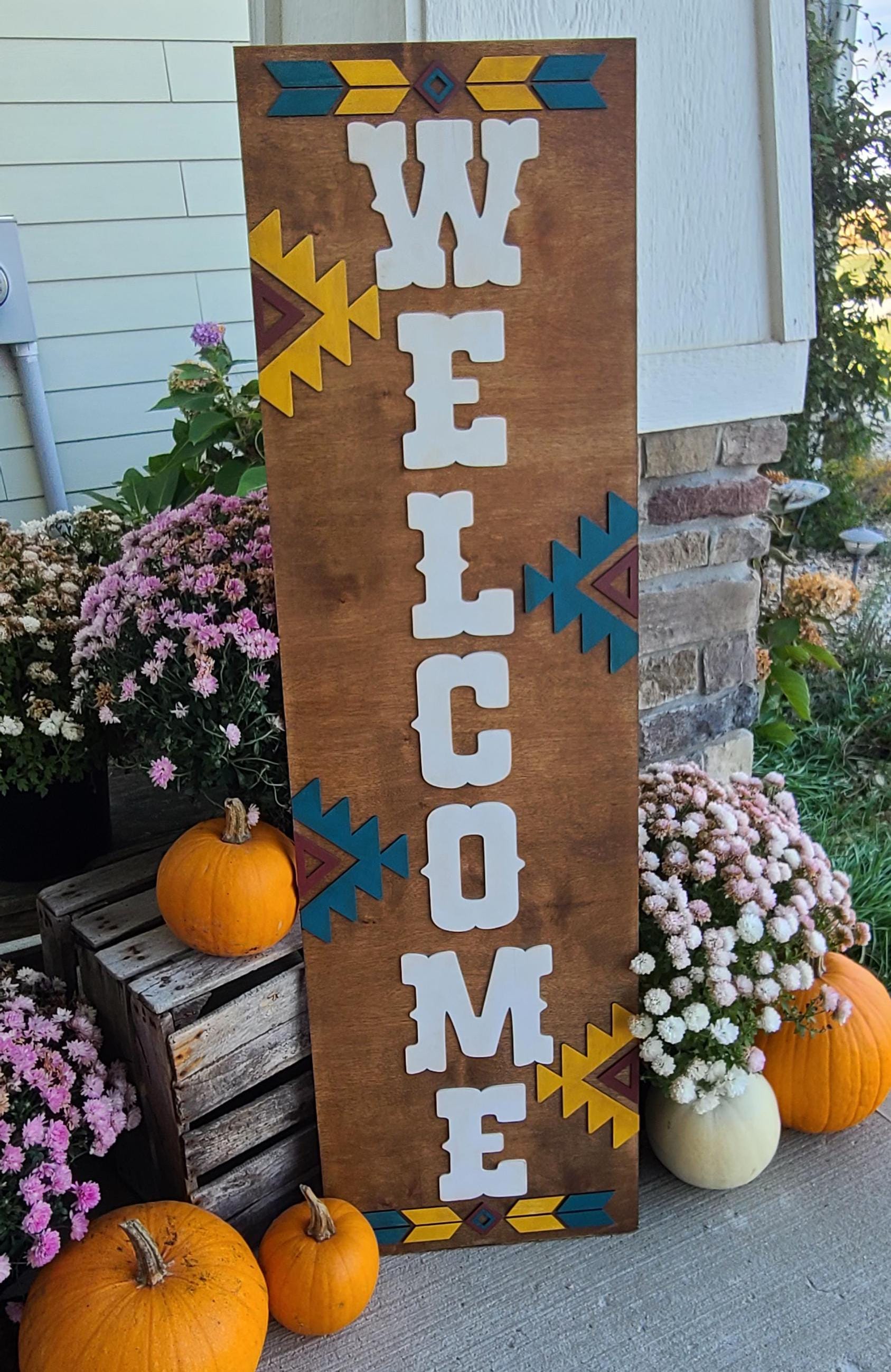 Rustic Western Aztec Welcome Front Porch Leaner Sign. Stained 1/2 inch Birch Plywood, Lightly Distressed Aztec Design. Laser Cut Wooden Letters. All Signs Are Hand Cut, Hand Painted, and Stained. Letters and Aztec Design are Laser Cut and Hand Painted.